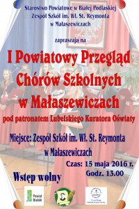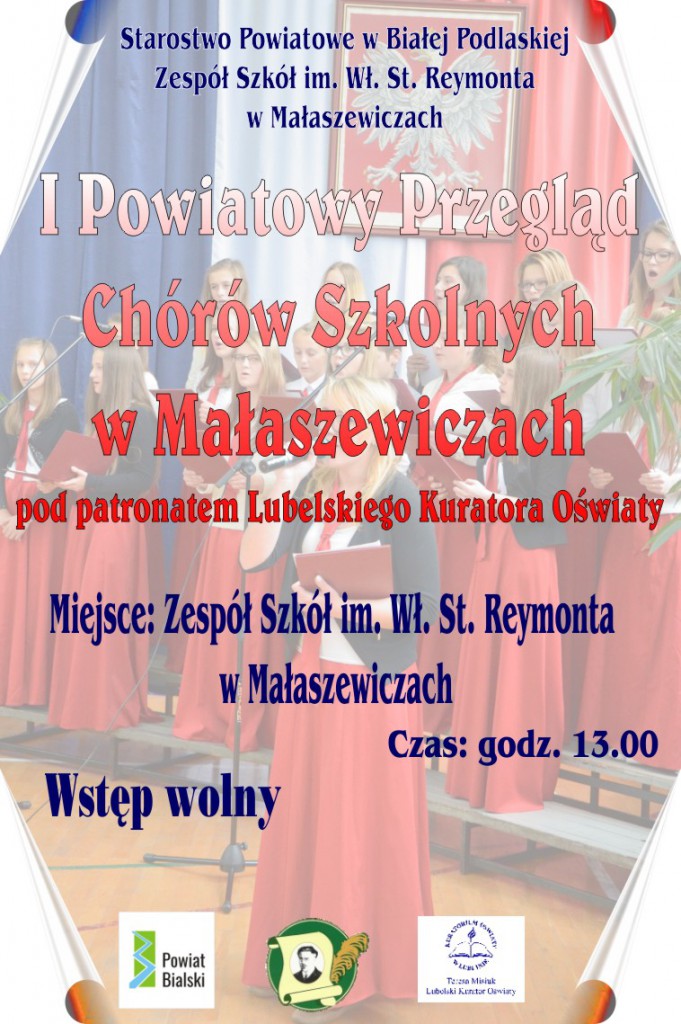 Starostwo Powiatowe w Białej Podlaskiej wspólnie z Zespołem Szkół im. Wł. St. Reymonta w Małaszewiczach organizuje I Powiatowy Przegląd Chórów Szkolnych, który odbędzie się 15 maja od godziny 13.00 w powyższej szkole. Serdecznie zapraszamy