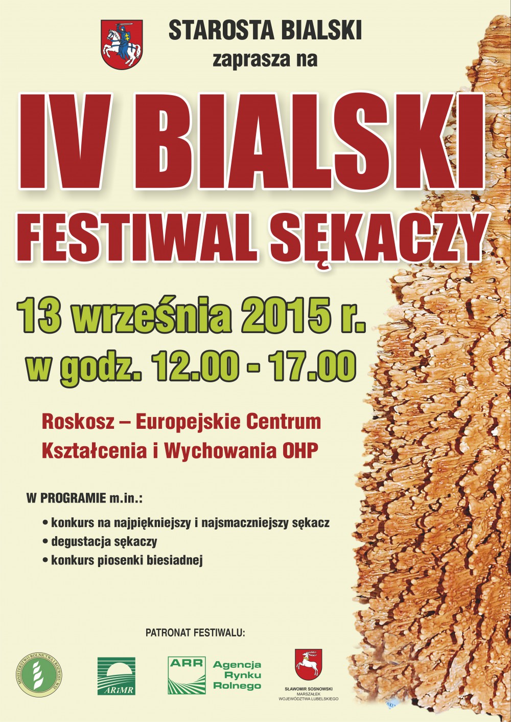 zaproszenie na sękacze 7 września 2015 / Przez Anna Jóźwik Już po raz kolejny Starostwo Powiatowe będzie organizować Bialski Festiwal Sękaczy. Na przybyłych do Roskoszy 13 września czeka moc atrakcji. Poniżej plakat przedsięwzięcia. Serdecznie zapraszamy