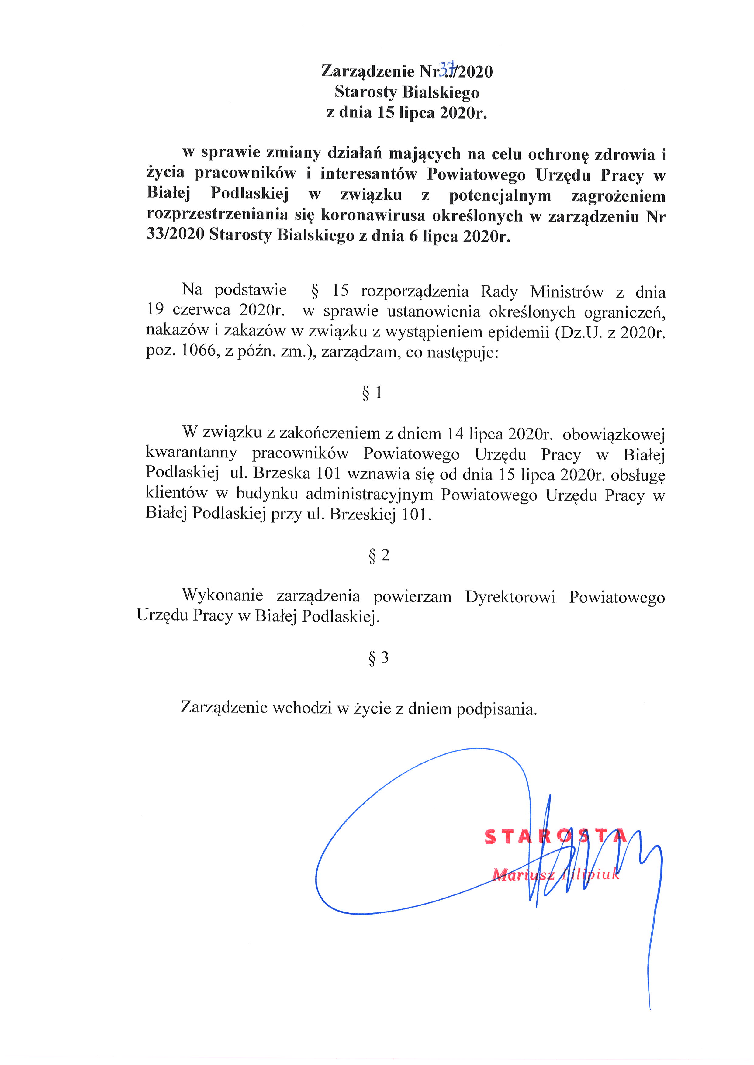 Zarządzenie Nr 37/2020 Starosty Bialskiego z dnia 15 lipca 2020 r. 15 lipca 2020 / Przez Katarzyna Żak