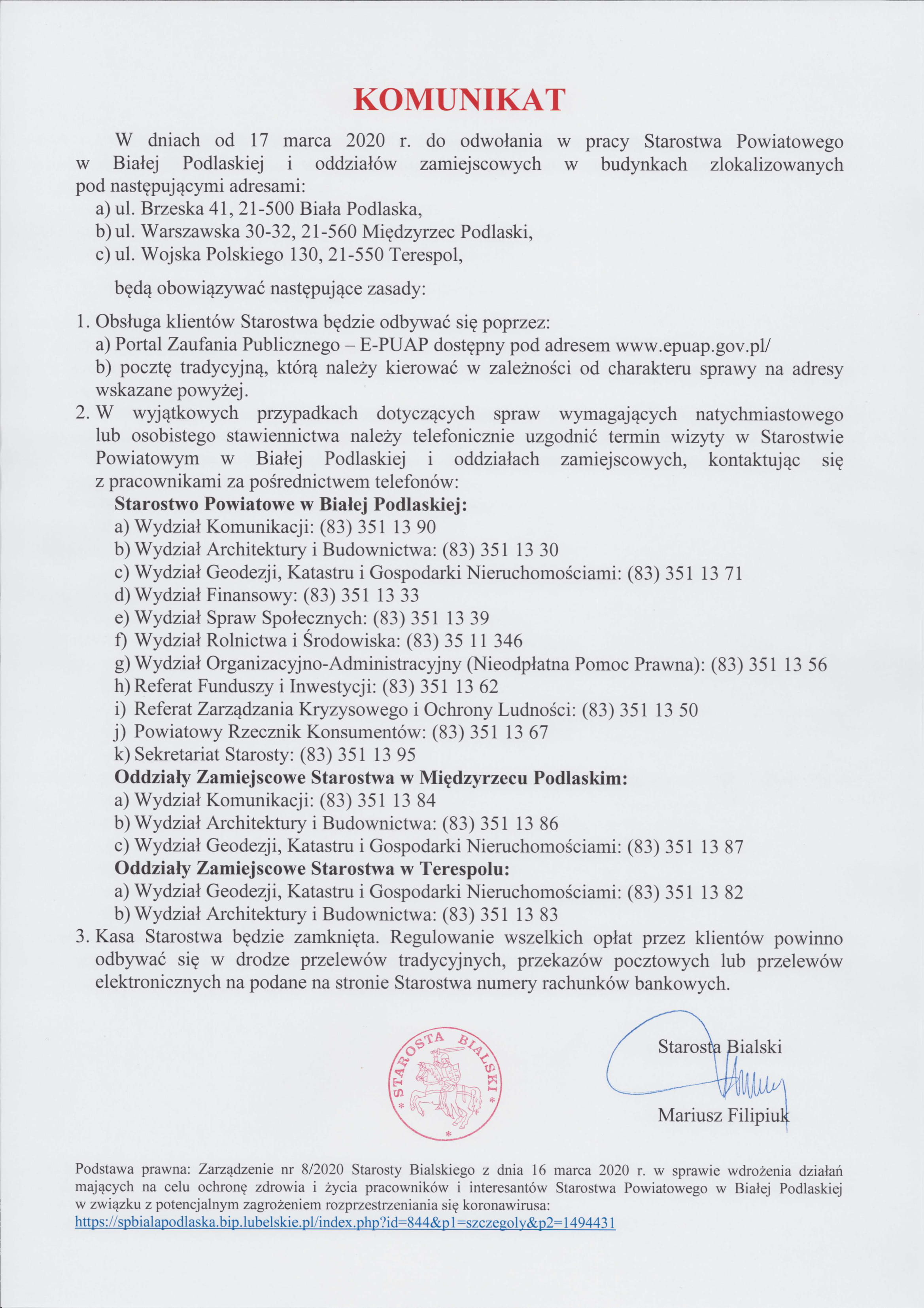 Zarządzenie starosty i komunikat o pracy Starostwa w związku z koronawirusem 16 marca 2020 / Przez Jakub Witczak Zarzadzenie_Starosty_8_2020