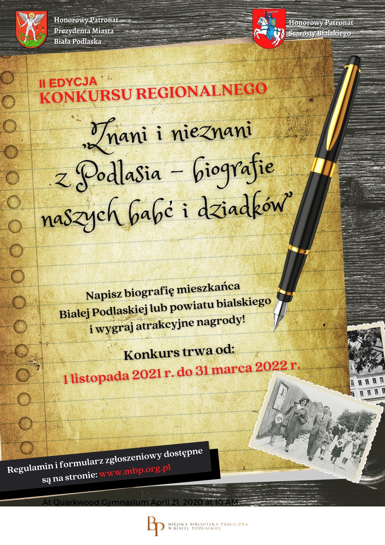 Zapraszamy mieszkańców Białej Podlaskiej oraz wszystkich miejscowości z terenu powiatu bialskiego, młodzież i dorosłych, do udziału w II edycji konkursu regionalnego „Znani i nieznani z Podlasia – biografie naszych babć i dziadków”. Patronat nad konkursem objęli: Starosta Bialski Mariusz Filipiuk i Prezydent Miasta Biała Podlaska Michał Litwiniuk.