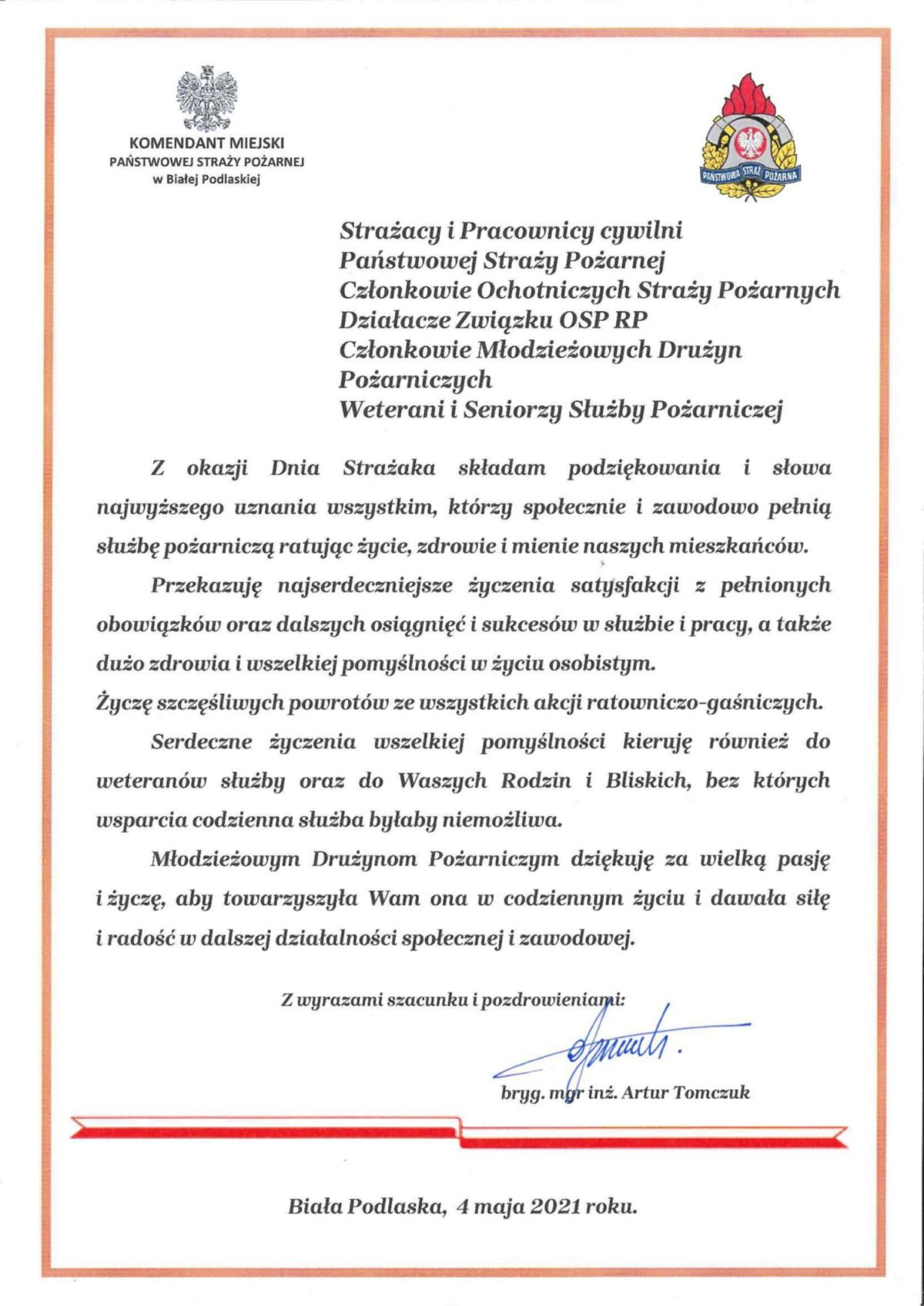 Życzenia z okazji Dnia Strażaka od Komendanta Miejskiego Państwowej Straży Pożarnej w Białej Podlaskiej 30 kwietnia 2021 / Przez Edyta Szafrańska